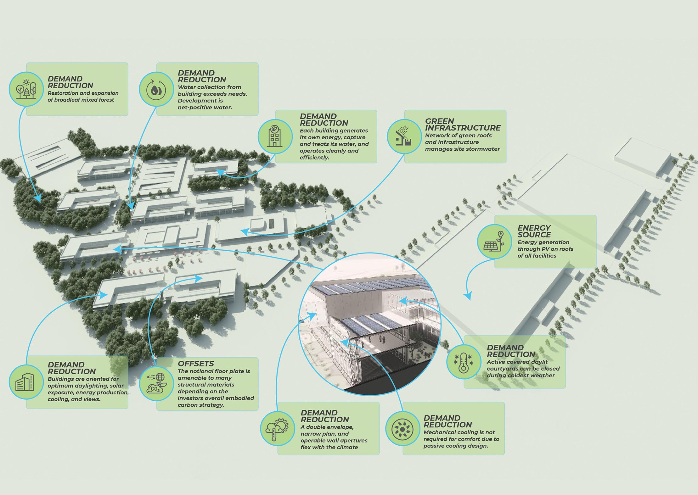 To reduce the overall demand passive design elements such as building orientation, ecosystem restoration, and green infrastructure are introduced at a site-wide level. At a building-level, buildings are oriented to maximize daylight and eliminate the need for mechanical cooling.