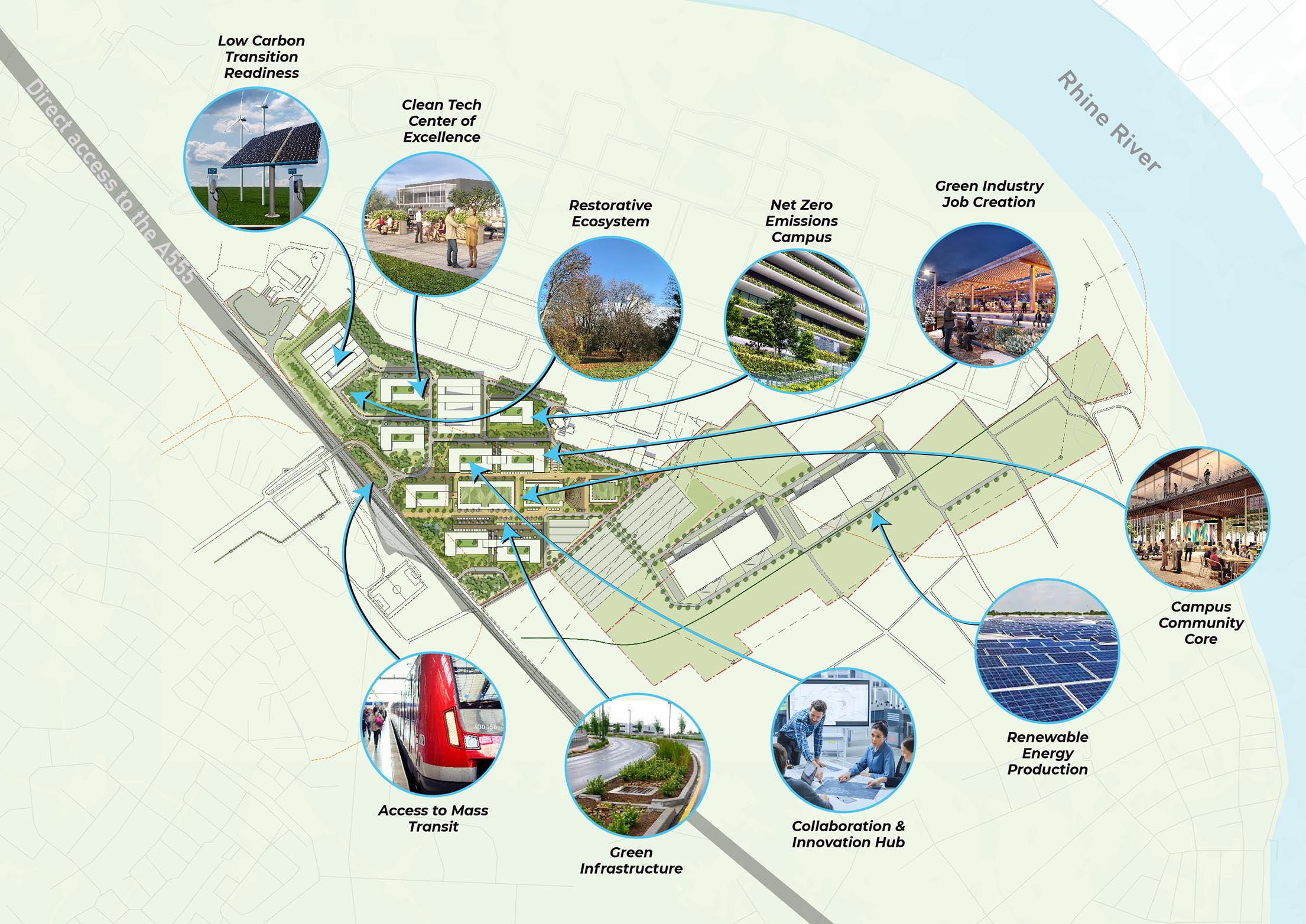 The REC campus includes 27.3 hectares zoned for commercial office development and 16 hectares for trade and industrial. Based on the City of Wesseling zoning requirements the carrying capacity for the site is comprised of 139,000sm of office and support amenities and 40,000sm of warehouse and workshop space. The vision for REC is aligned with the Wesseling 2040 plan. REC is connected to the community and wider region via A555 and Tram Line 16 with station Wesseling Sud located across from the campus entrance.